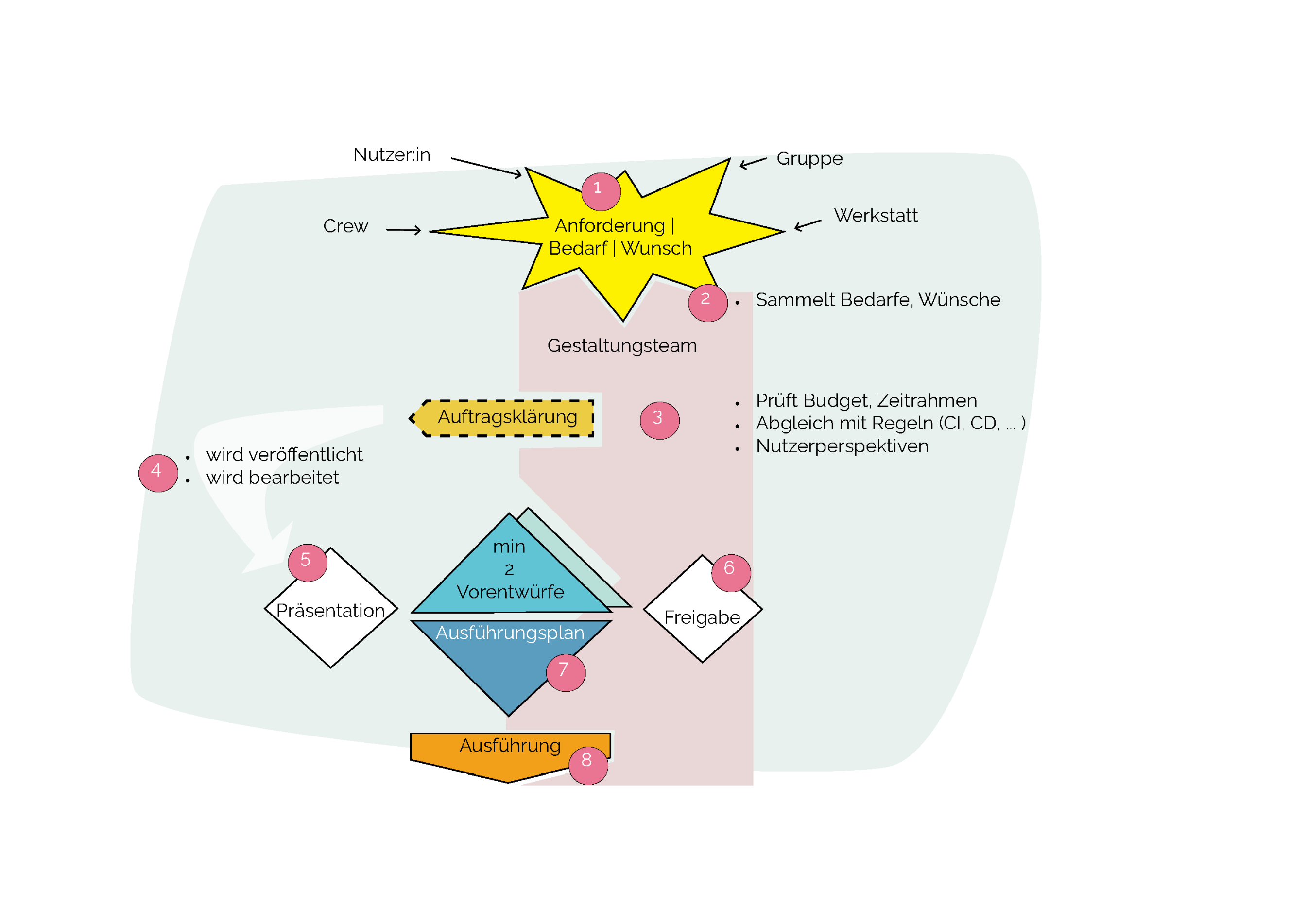 Das Gestaltungsteam kann pragmatische Entscheidungen ad hoc treffen, Vorschläge für Themen mit Tragweite präsentiert es dem Beirat / der Crew per Entscheidungsvorlage.
