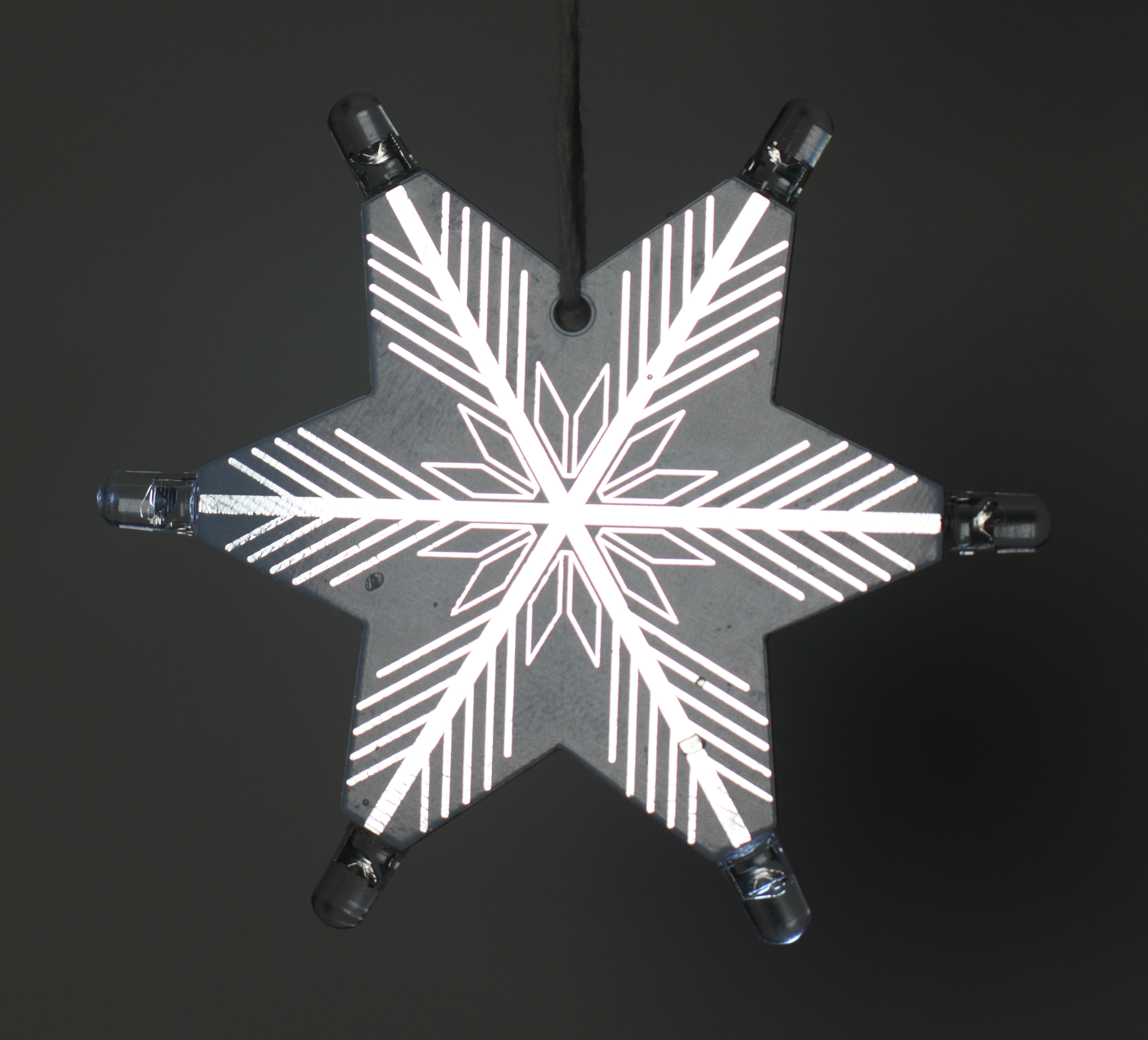 Parallel dazu entstand die Idee eines sechszackigen Sterns mit einem Eiskristall-Motiv. Die erste Version setzte auf eine weiße Lötstoppmaske und kupferfreie Flächen, um ein Durchleuchten von hinten zu ermöglichen. Dieses Konzept wurde verworfen, da kein Platz für Batterie und Schalter vorhanden war und eine externe Stromversorgung nötig gewesen wäre.