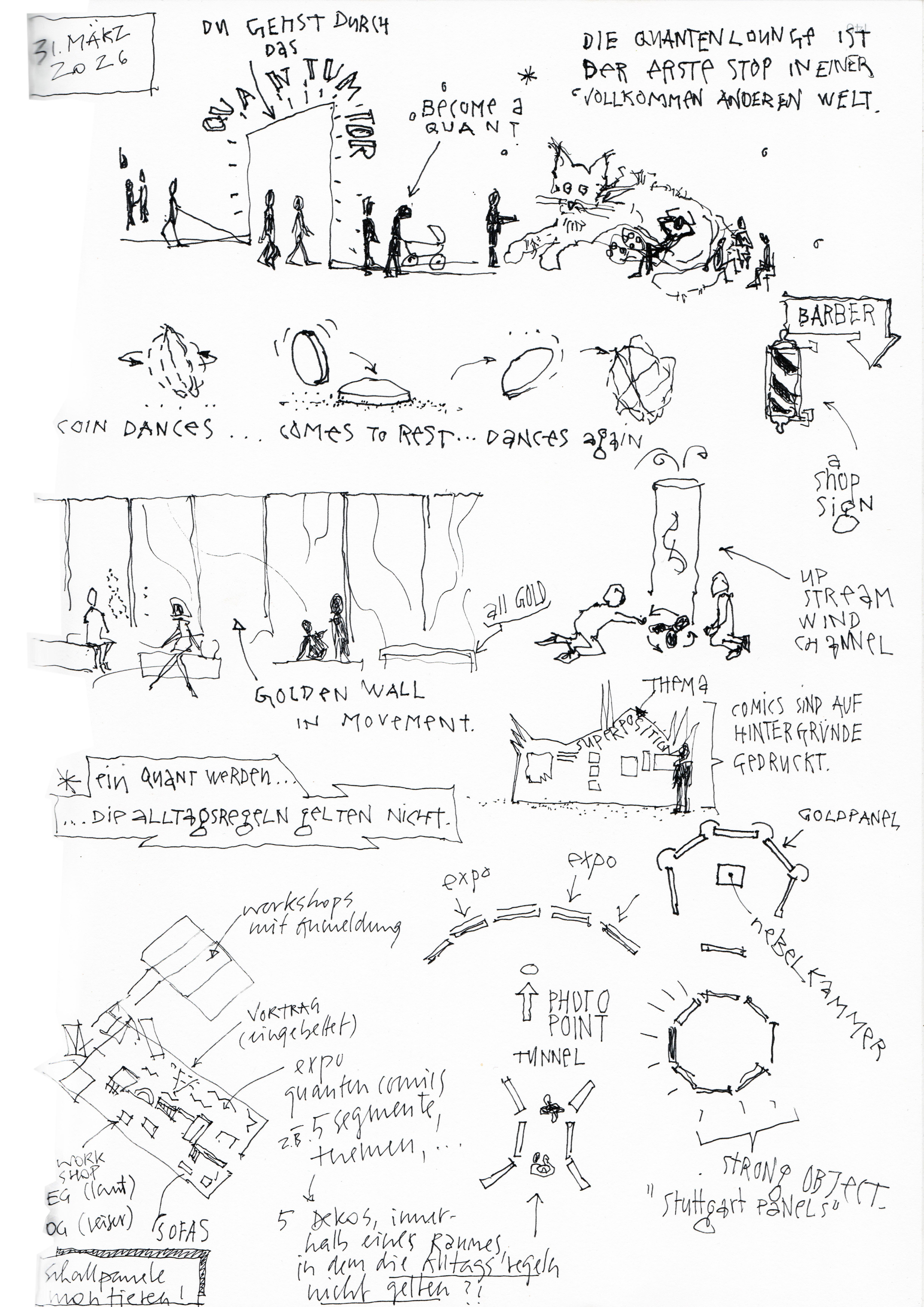 In die Quantenwelt eingebettet sind besondere ikonische Elemente: Ein auf die Strasse reichendes Quanten-Tor (vielleicht auch Tunnel), bei dessen Durchschreiten Besuchende in die Quantendimension eintreten, ein Lüster-artiges Spiegel-Leucht-Objekt, das formal angelehnt an die aktuelle Erscheinung von Quanten-Computern als markanter und gern genutzter Foto-Hintergrund dient.